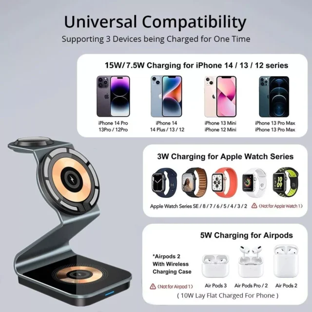 • 3-in-1 Charging: Simultaneously charges your iPhone, Apple Watch, and AirPods.