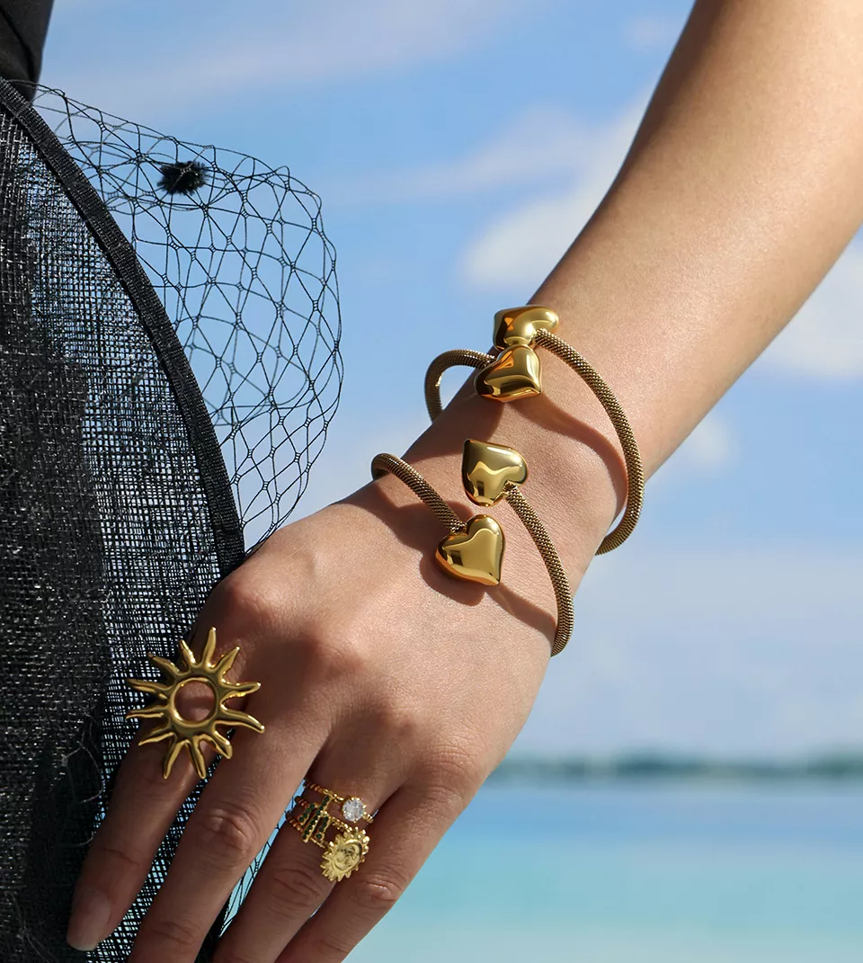This bracelet features a sleek, flexible cuff structure that wraps comfortably around your wrist. Its standout feature—a glossy heart charm—adds a subtle yet meaningful touch that elevates both casual and formal looks. Whether worn alone or layered with other pieces, this bracelet captures timeless style with a contemporary twist. It’s non-tarnish, waterproof, and made to shine through everyday wear and beyond.