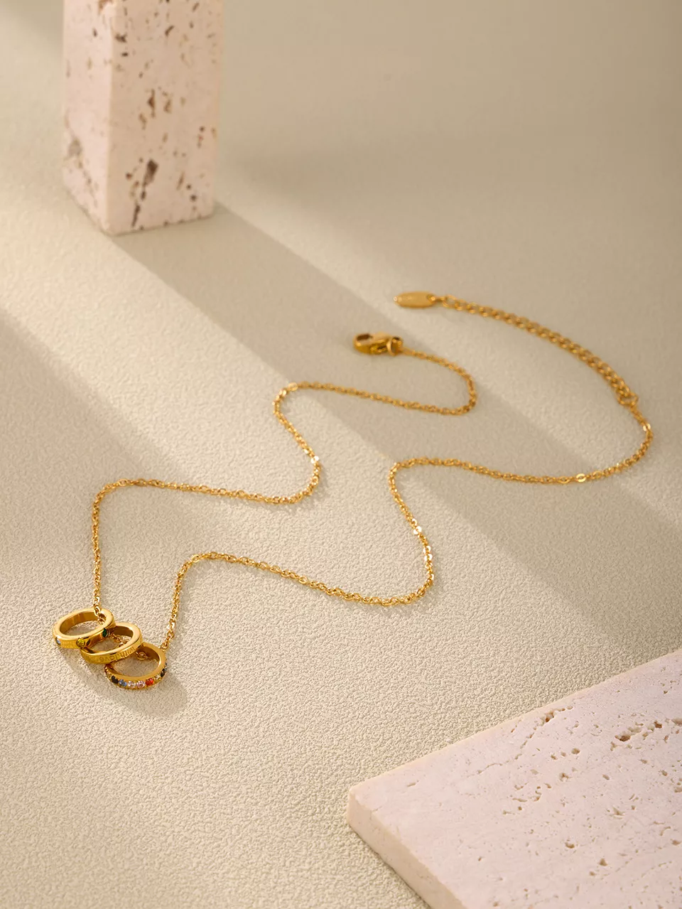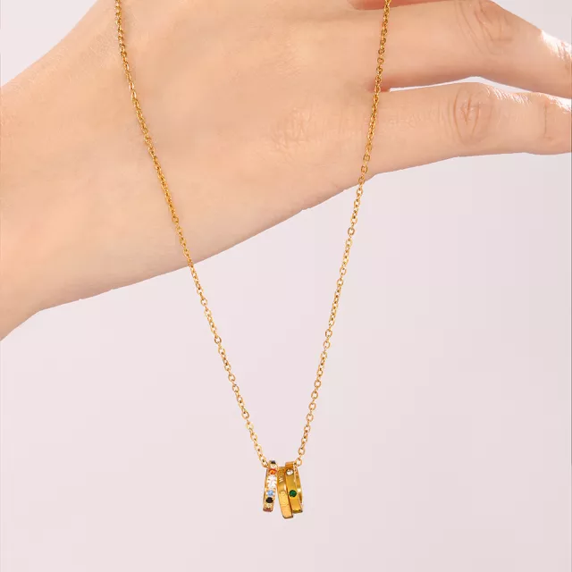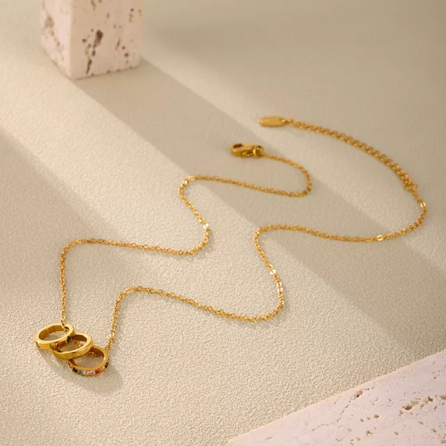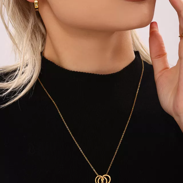 Its clean, minimalist design makes it a versatile accessory that complements both casual and formal looks. The triple pendant detail stands out without overpowering your style, making it ideal for layering or wearing on its own. With its radiant 18K gold plating, this necklace brings a luxurious shine that lasts.