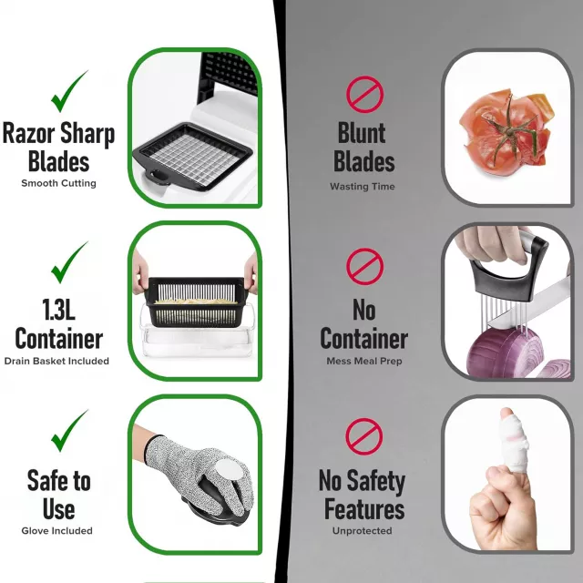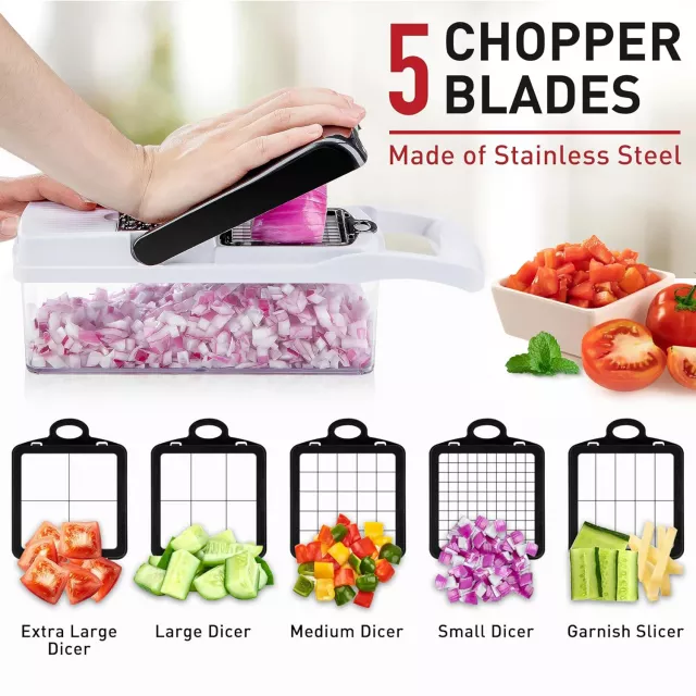 This vegetable cutter comes packed with 13 ultra-sharp stainless steel blades designed to handle everything from delicate slicing to robust grating. Use it to chop onions, dice tomatoes, julienne carrots, shred potatoes, or even spiralize zucchinis for healthy veggie noodles. Each blade is crafted from durable food-grade stainless steel, ensuring long-lasting use without rust or bending.