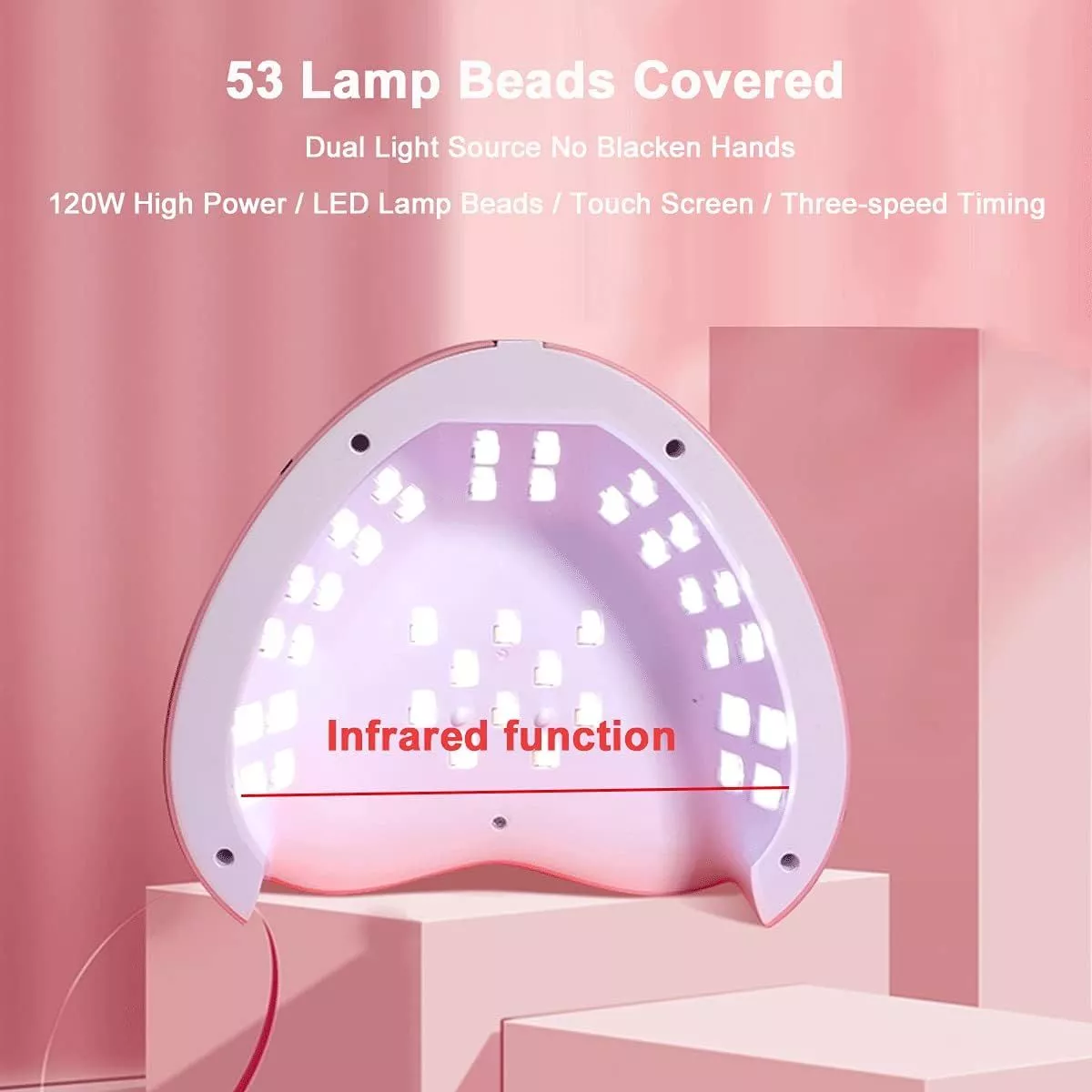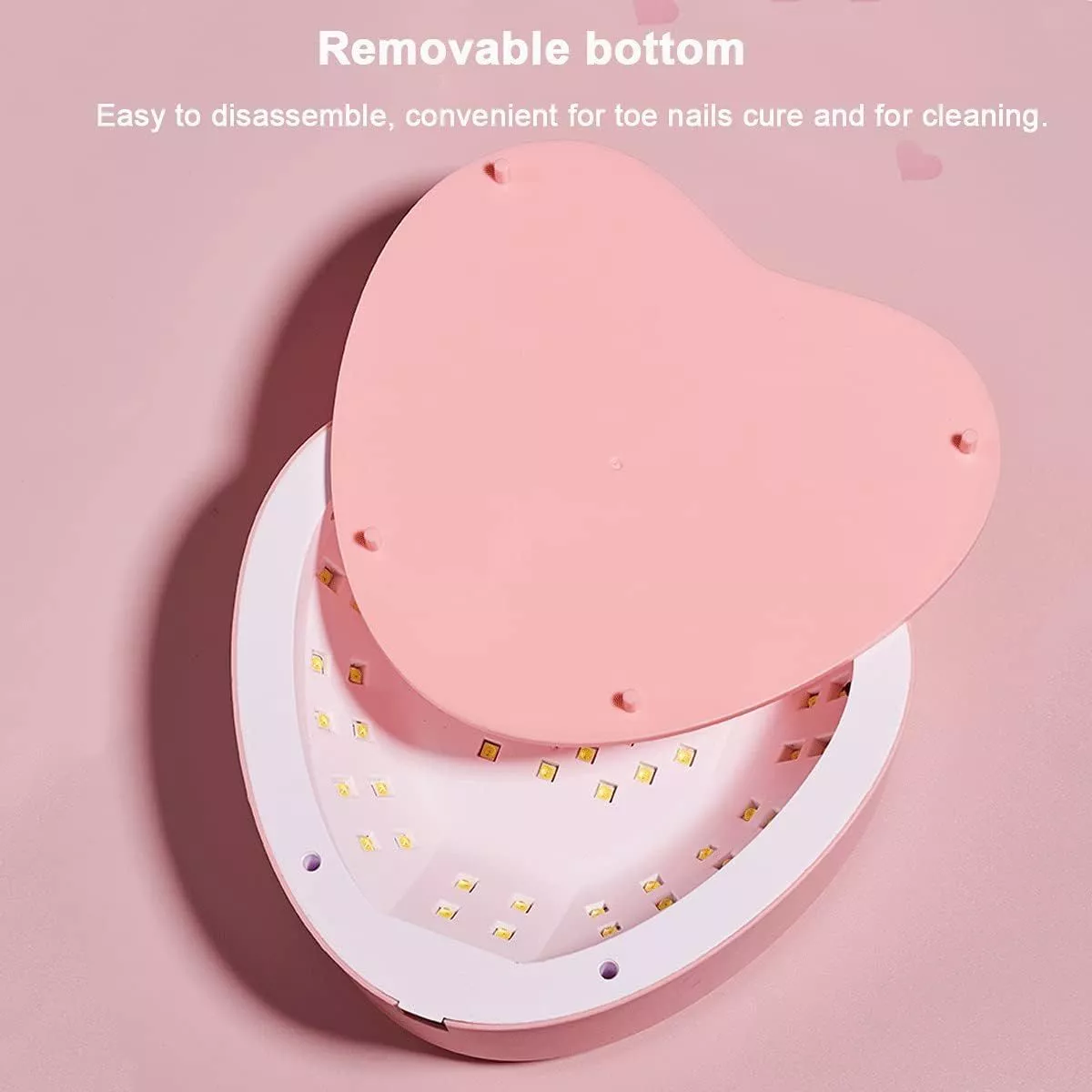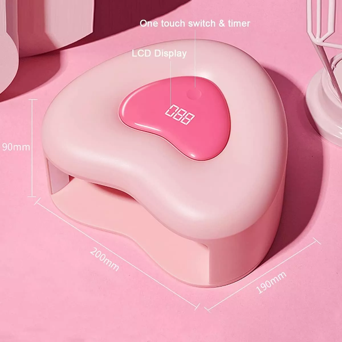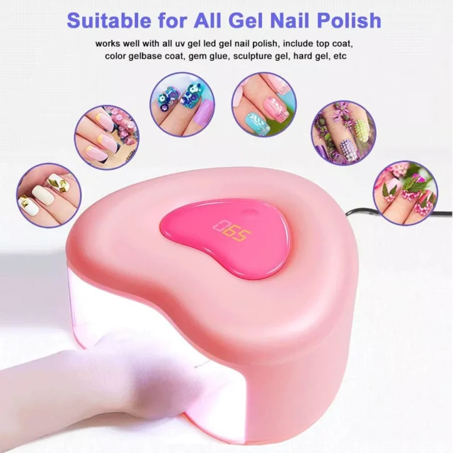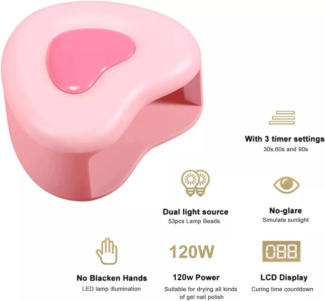 Our heart-shaped UV LED Nail Lamp is not just a tool; it’s your partner in achieving salon-quality nails at home. It’s specially designed to save you 80% of curing time compared to traditional nail lamps, making it a time-efficient choice for those who value both beauty and productivity. Whether you’re working with regular, dark, or thick gel polish, our lamp has you covered with its three timer settings, ensuring a perfect cure every time without the risk of pain or discomfort. Its charming pink heart design not only looks great on your vanity but also reflects the love and care you put into your nail art.