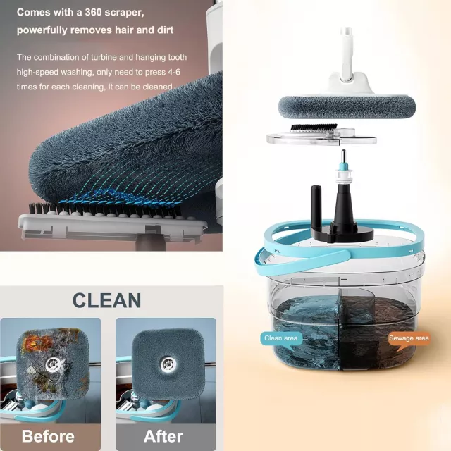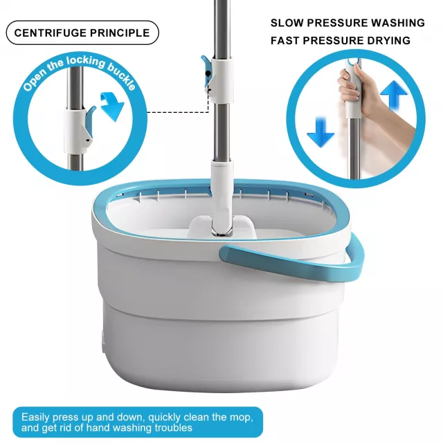 • Built-In Mop Scrubber – Cleans the mop pad with every spin inside the bucket, hands-free.