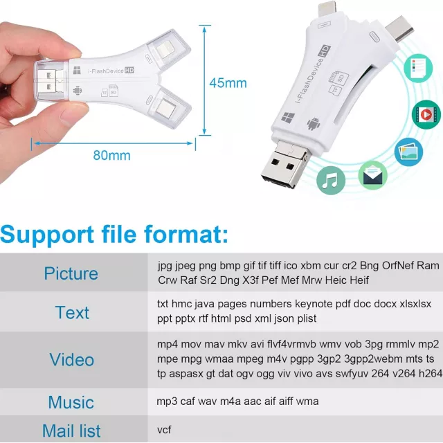 This reader stands out thanks to its wide compatibility and practical design. Featuring four built-in interfaces — USB 2.0, Type-C, Micro USB, and Lightning — it connects seamlessly to nearly any device, from Android smartphones and iPhones to tablets, PCs, and laptops. Whether you’re dealing with SD cards, TF cards, or SIM cards, it handles them all with ease.