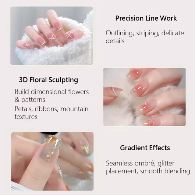 This set is your go-to solution for creating delicate lines, floral patterns, abstract designs, or bold details with ease. Use it with gel polish, acrylic paint, or regular polish to create everything from minimalist lines to 3D effects. Ideal for both beginners and professionals, this brush set makes precision work feel effortless.