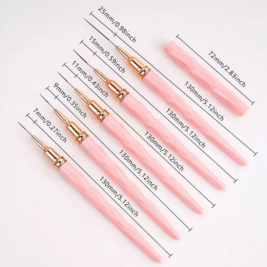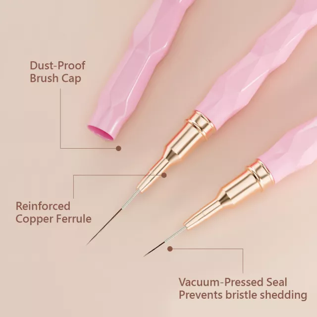 The brush set includes five ultra-fine liner brushes with tip lengths of 0.28 in, 0.35 in, 0.43 in, 0.59 in, and 0.98 in, giving you full control over your designs. The brushes are crafted with high-quality nylon bristles and firmly held with a glue-sealed ferrule to prevent shedding. The diamond-shaped handle not only adds a stylish touch but also offers a lightweight, ergonomic grip for easy handling and detailed control.