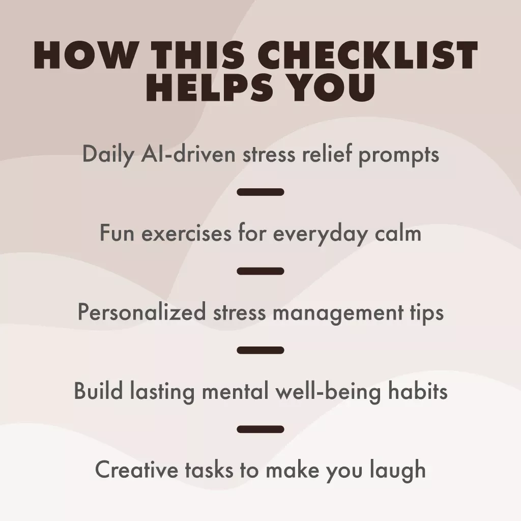 • Day 1 – Meet Your Stress: Identify your biggest stressor and rate it, with a fun twist: Ask AI for a humorous perspective!