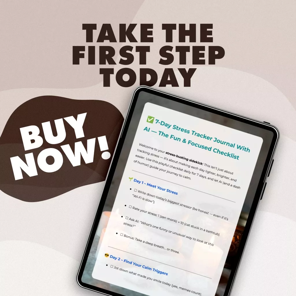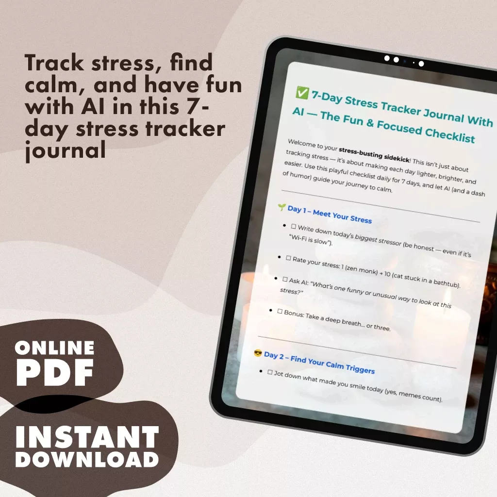 Don’t let stress hold you back. Download the 7-Day Stress Tracker Journal With AI today and take the first step towards a calmer, more focused you. With just 7 days of playful reflection, you’ll discover new ways to cope, relax, and even laugh along the way. Get your digital download now and turn stress into your superpower!