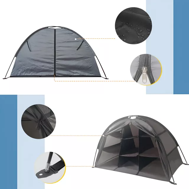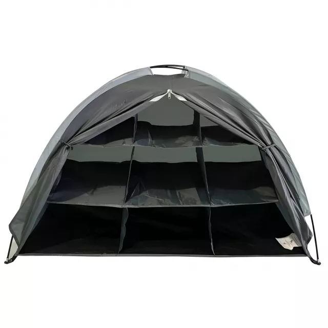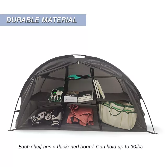 Crafted from high-quality polyester fiber and reinforced with sturdy shelves, each compartment can hold up to 30 pounds of gear. Its zippered front flap keeps dust, dirt, and insects out, while the open design makes it easy to access your items whenever you need them. The lightweight frame includes a ground strap for staking, giving it extra stability even in outdoor conditions.