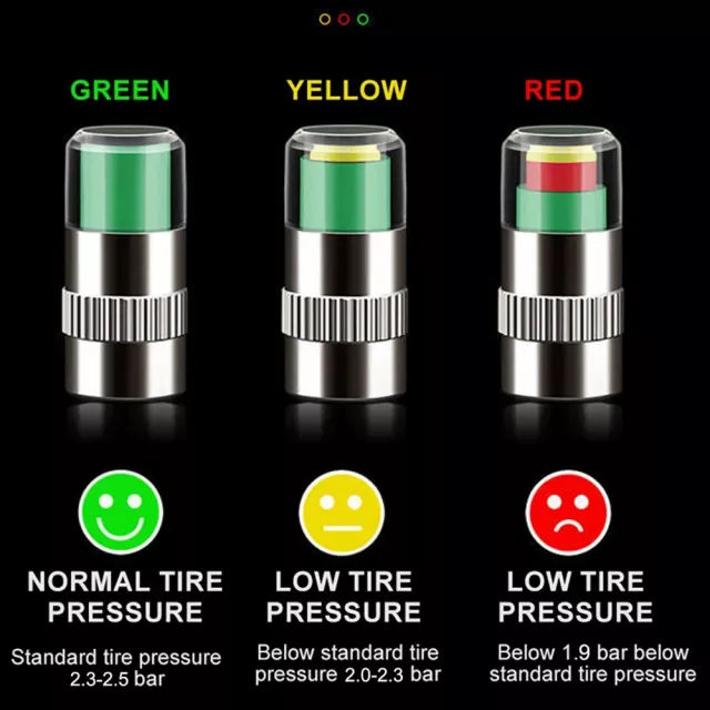 Built with a durable copper and stainless steel body, these valve caps are made to withstand harsh weather, dirt, and daily driving wear. The integrated color-coded system gives you a quick, visual check of your tire pressure at a glance: Green means you’re in the safe range (2.3–2.5 bar), Yellow signals low pressure (2.0–2.3 bar), and Red warns of dangerously low pressure (≤1.9 bar). Installation takes just seconds—simply screw them onto your tire valves and you’re ready to go.