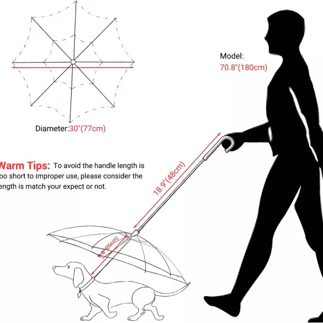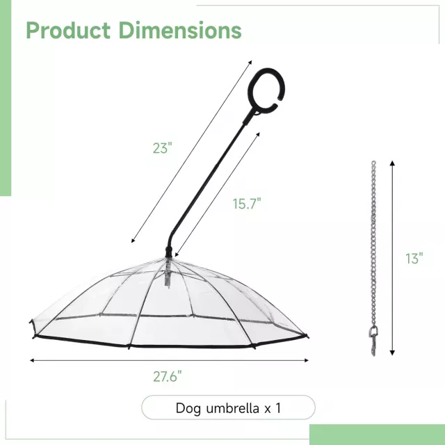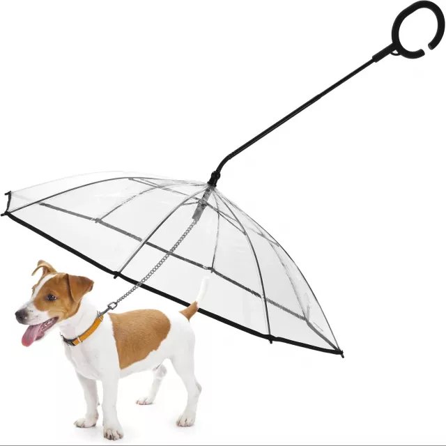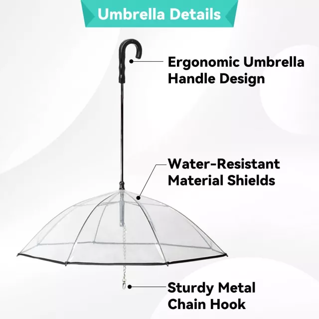 Crafted from strong transparent PE material, this umbrella is paired with a chrome-plated steel frame and a reliable iron chain leash. The compact yet sturdy construction ensures your dog stays shielded from the rain while you maintain full control with the built-in leash. The unique C-shaped handle is easy to grip and comfortable to hold, making it perfect for those rainy strolls.