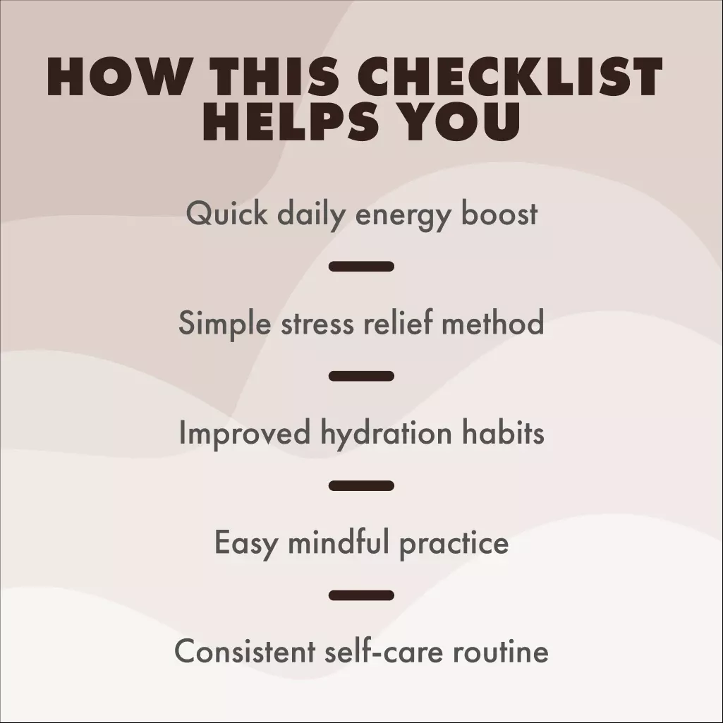 • Step-by-step checklist with six easy practices (breathing, mindful sipping, reflection, stretching, and more)