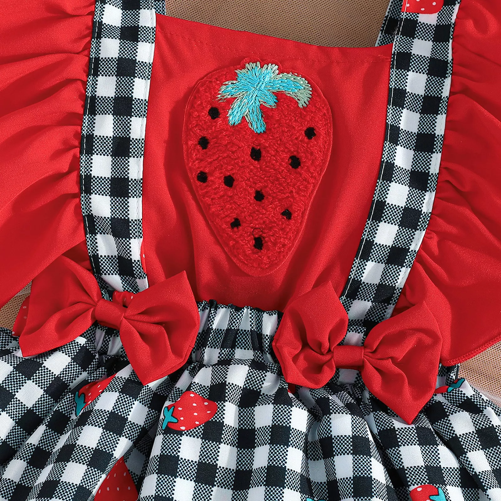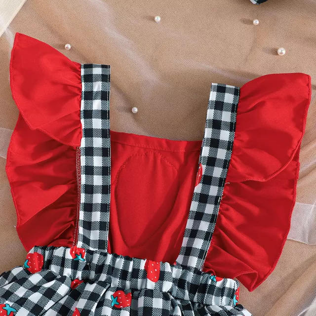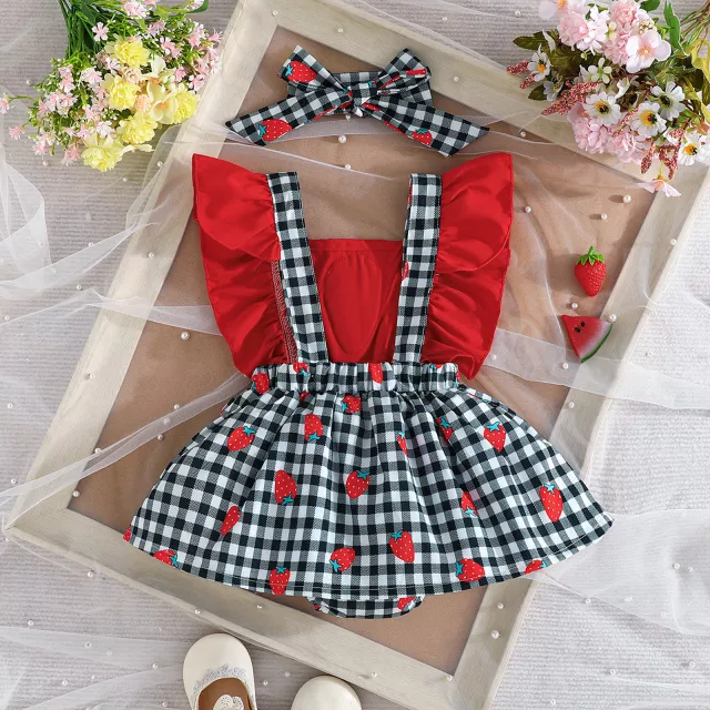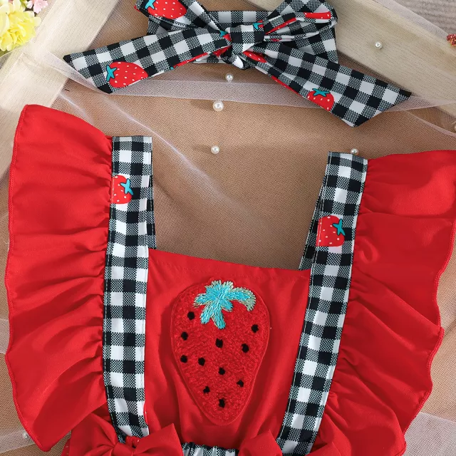 With its cute fly sleeves and vibrant strawberry plaid pattern, this romper dress is designed to turn heads. The square neckline adds a touch of vintage charm, while the lightweight material feels soft against delicate skin. Complete with a matching headband, this set offers a coordinated look that’s both adorable and practical.