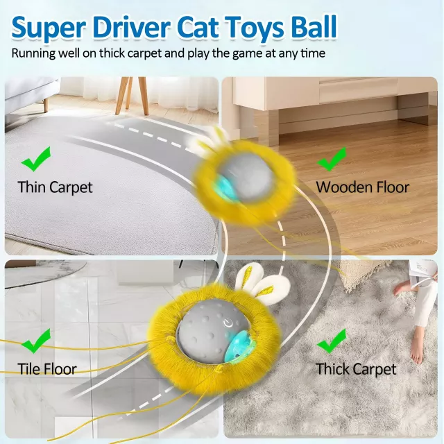 With three exciting motion modes, this toy adapts to your cat’s mood and energy level. Choose from fast running (blue light), slow rolling (purple light), or the interactive mode (yellow light) where your cat’s touch activates the fun. Whether you have hardwood, marble, tile floors, or even low-pile carpet, this toy glides effortlessly, encouraging pouncing, chasing, and playful stalking.