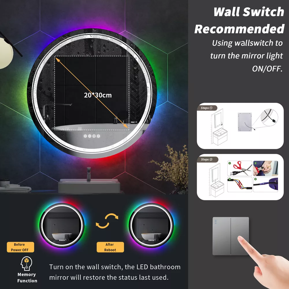 We recently renovated our master bath and decided to go with this round LED mirror...and boy am I glad we did! Not only does it offer great visibility due its large size but also brings an elegant touch that perfectly complements our modern decor theme. The LEDs are super bright yet don’t strain your eyes which is fantastic especially for early morning makeup application or shaving needs...but wait there’s more: you get to play around with different lighting moods! My wife loves setting calming blues for her relaxing baths while kids enjoy changing colors before brushing their teeth at night – making toothbrushing time less of a chore. On top of that, we don’t have any more issues dealing with steamy reflections after hot baths or showers thanks to its effective anti-fog function…what else could you ask for?! This stylish piece certainly doesn't compromise on practicality and has added a touch of luxury to our bathroom.