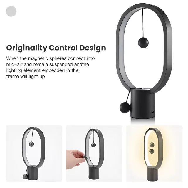 What sets this lamp apart is its innovative magnetic switch. Two elegantly crafted wooden balls float in the center of the frame — when you lift the bottom ball and it connects magnetically with the top ball, the lamp lights up. A simple gesture turns the light on and off, adding a playful yet sophisticated touch to your daily routine. The LED light is subtly embedded in the sleek ABS frame, giving it a modern, minimalist look that suits any decor.