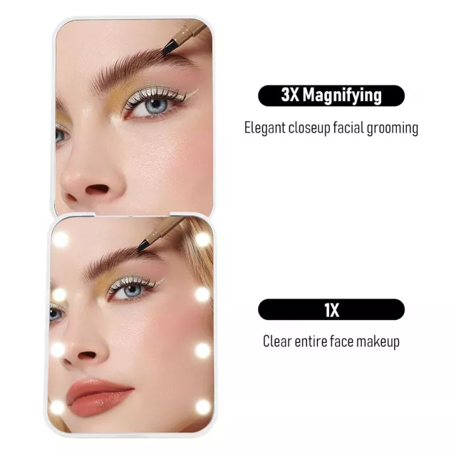 Enjoy the best of both worlds with the dual-mirror design. The standard 1X mirror offers a clear, natural reflection perfect for overall checks, while the 3X magnifying side lets you focus on finer details like eyeliner, lipstick, and tweezing with precision. Enhanced by built-in LED lighting, this mirror illuminates your face in low-light environments—so you never miss a spot, day or night.
