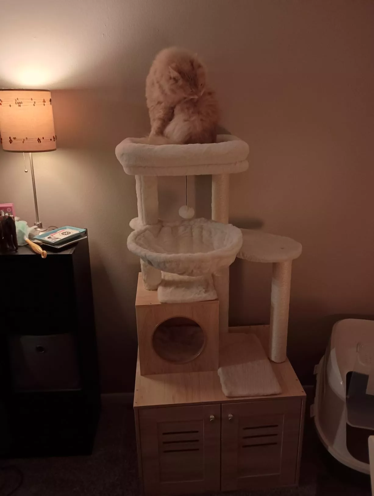 As someone who's not the handiest and lacks strength, it took me a solid three hours to put this together with just the included tools. The instructions were okay – could be clearer, but manageable. A drill would've made the process much quicker, especially since manually screwing was a challenge, hinting at the quality of the materials. The fabric is soft but sheds quite a bit when tugged at. My cat was immediately drawn to it, especially the litter box-turned-cozy bed at the bottom. The tree itself is heavy and very stable, no wobbling or tipping fears, even with my 11-pound cat exploring every inch. He's not too keen on the round basket at the bottom, probably a bit snug for him. Seems like this tree is more suited for lighter cats, but the palm leaf accessory adds a nice touch and variety. I'm quite pleased with it, especially since it's more affordable than similar items locally.