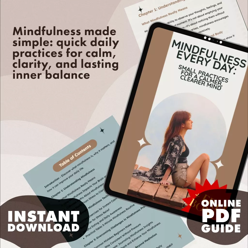 Discover how small, simple shifts can transform your daily routine with Mindfulness Every Day: Small Practices for a Calmer, Clearer Mind. This digital guide is designed to make mindfulness techniques easy, approachable, and practical—perfect for beginners and anyone who wants more peace and clarity in their day. Whether you’re navigating stress, seeking better focus, or just wanting to feel more present, this guide helps you build a habit that lasts. Download it instantly and start experiencing the benefits of mindfulness today.