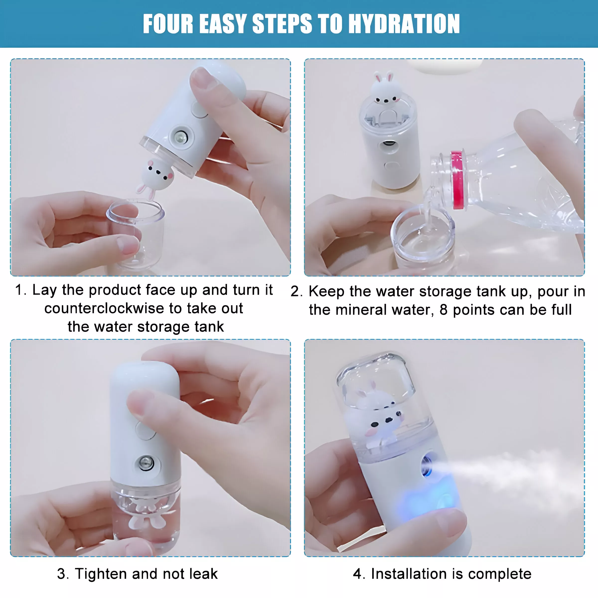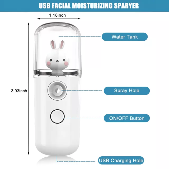 The Mini Bunny Face Mist Humidifier isn’t just cute — it’s built to perform. Using high-frequency oscillation technology, it converts water into ultra-fine particles that penetrate your pores, deeply moisturizing and revitalizing your skin from within. It’s ideal for dry environments, after sun exposure, during your skincare routine, or as a midday pick-me-up.