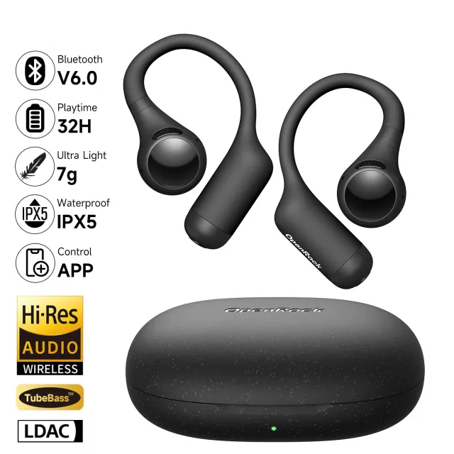 Each earbud weighs just 0.25 oz and features an ultra-light hook-clip design made with titanium filaments and soft liquid silicone for a secure, pressure-free fit. With an IPX5 waterproof rating and a triple-layer sweat-resistant structure, they’re built for the toughest workouts and outdoor adventures.