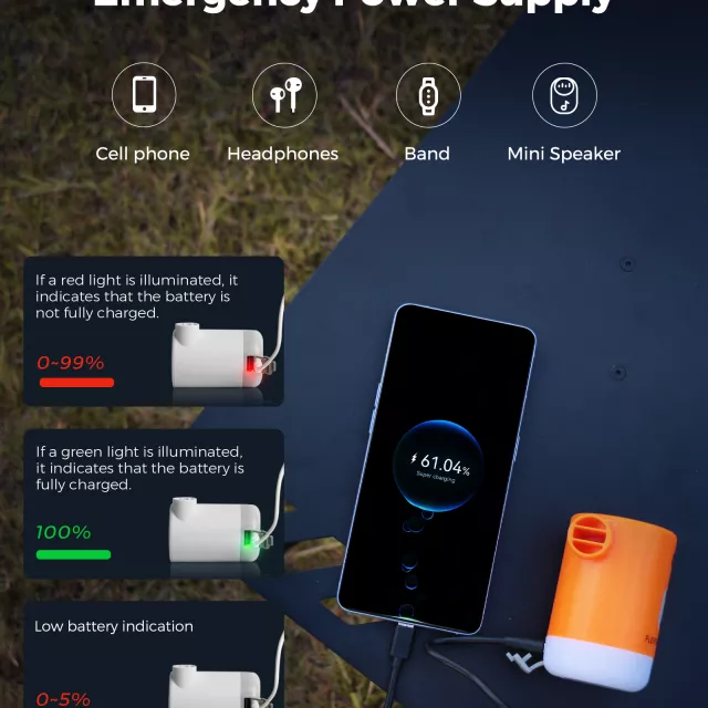 This portable air pump is more than just a tool—it’s your go-to solution for any outdoor situation. Use it when you’re camping, hiking, road-tripping, or simply enjoying the great outdoors. Its electric operation makes inflating air mattresses, pool floats, or inflatable furniture fast and effortless. When night falls, the adjustable LED light provides dependable illumination, and the emergency power supply ensures your phone or GPS never dies on you when you need it most.