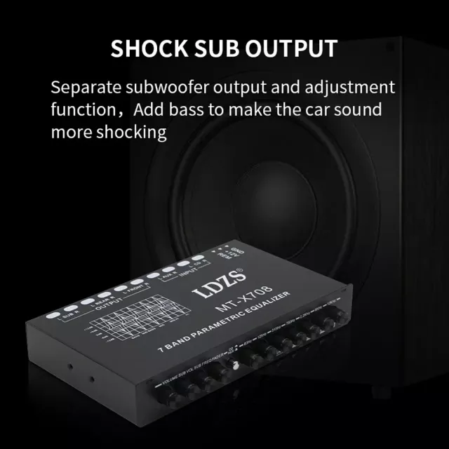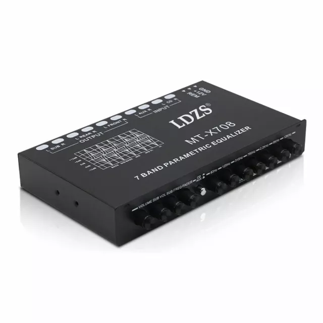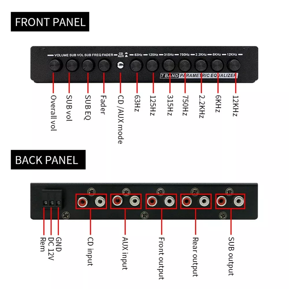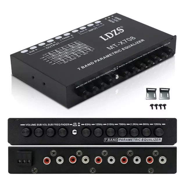 Crafted with a sleek metal chassis and smooth rotary knobs, this car audio equalizer is built for both performance and durability. It features a powerful 7-band graphic equalizer that lets you fine-tune frequencies at 63Hz, 125Hz, 315Hz, 750Hz, 2.2KHz, 6KHz, and 12KHz — ensuring every beat and note hits just right. With 6-channel outputs for front, rear, and subwoofer, it delivers a strong, clean signal to your amplifiers and speakers, reducing distortion and maximizing clarity. Easily switch between CD and AUX inputs with a dedicated control knob, and manage your subwoofer levels and frequency with precision adjustment controls.