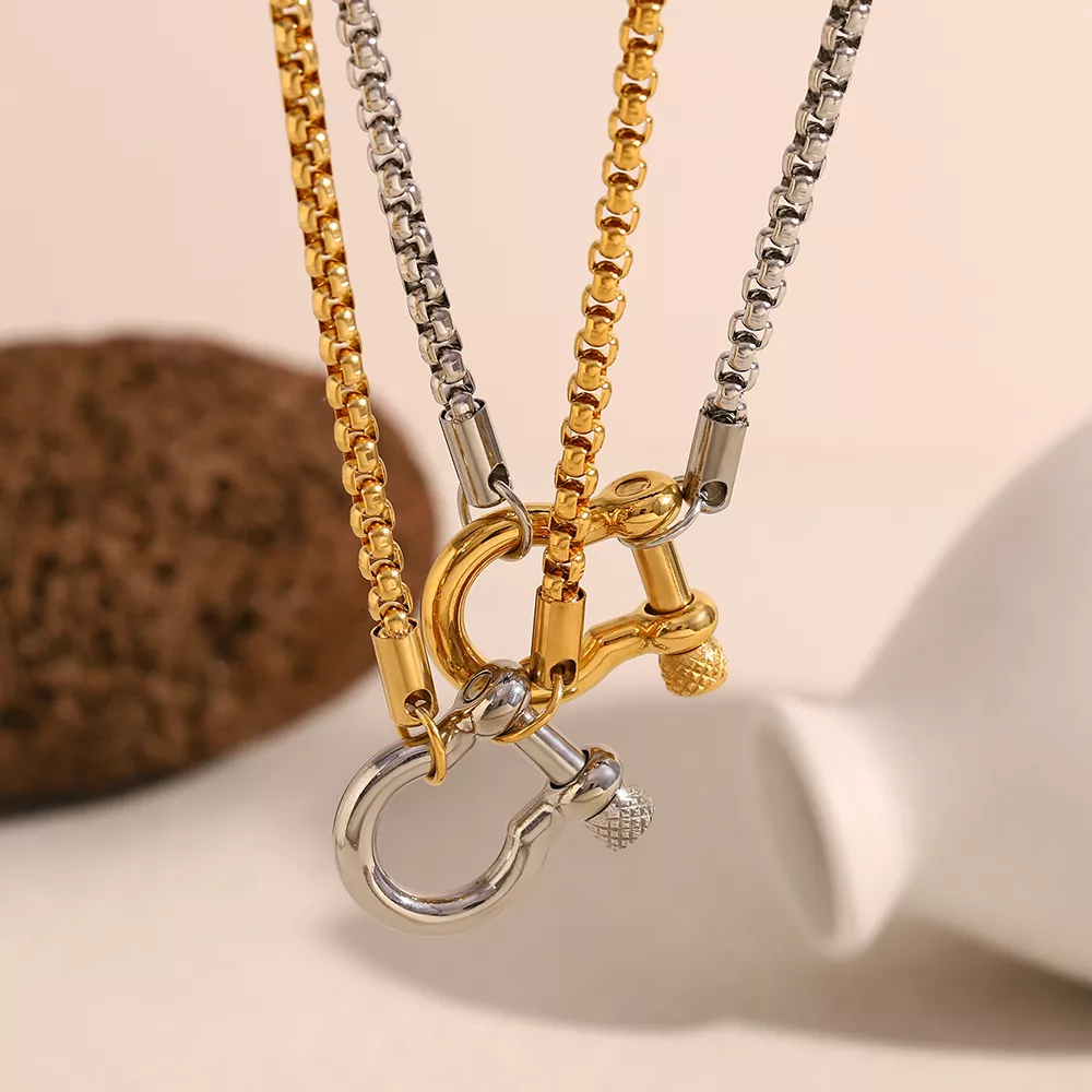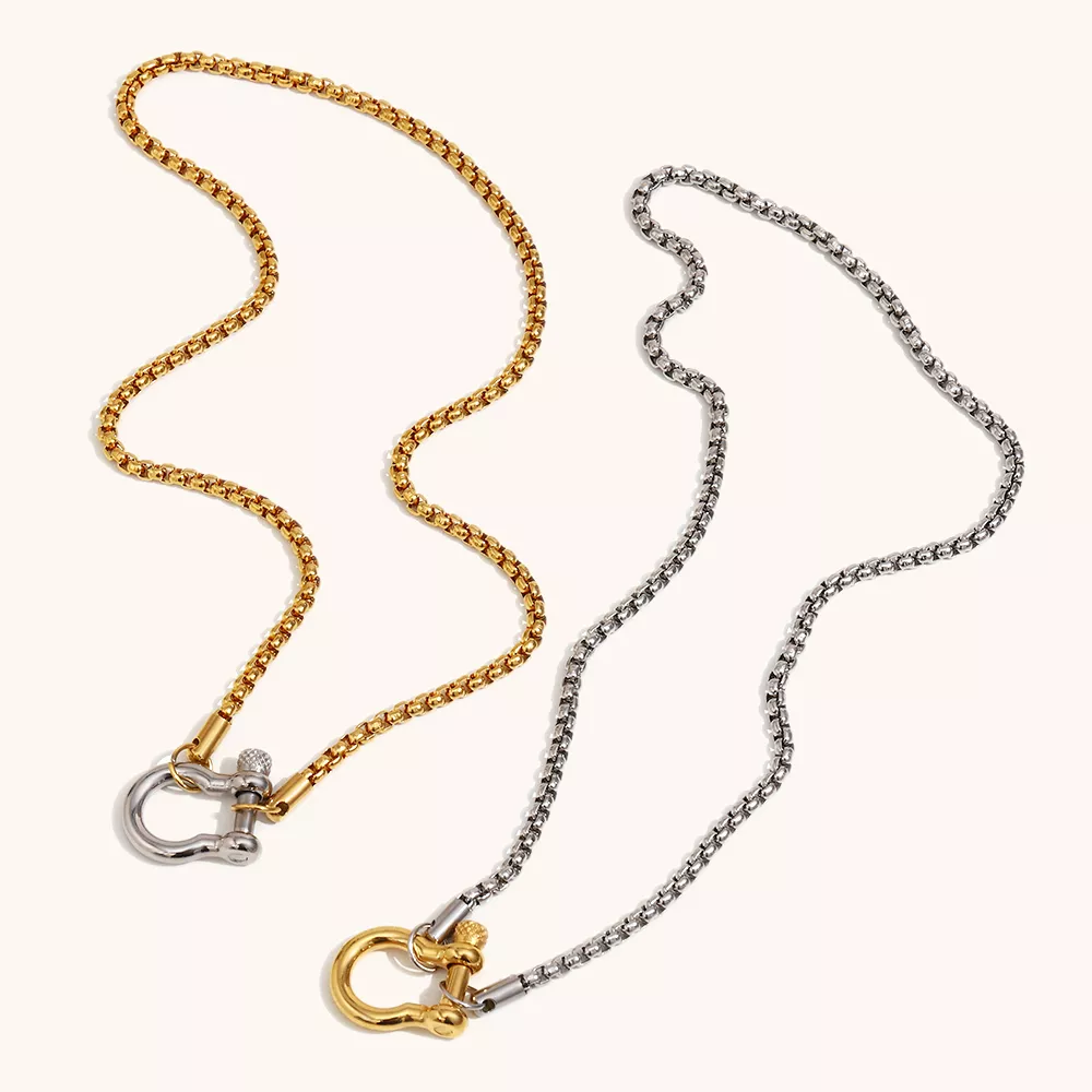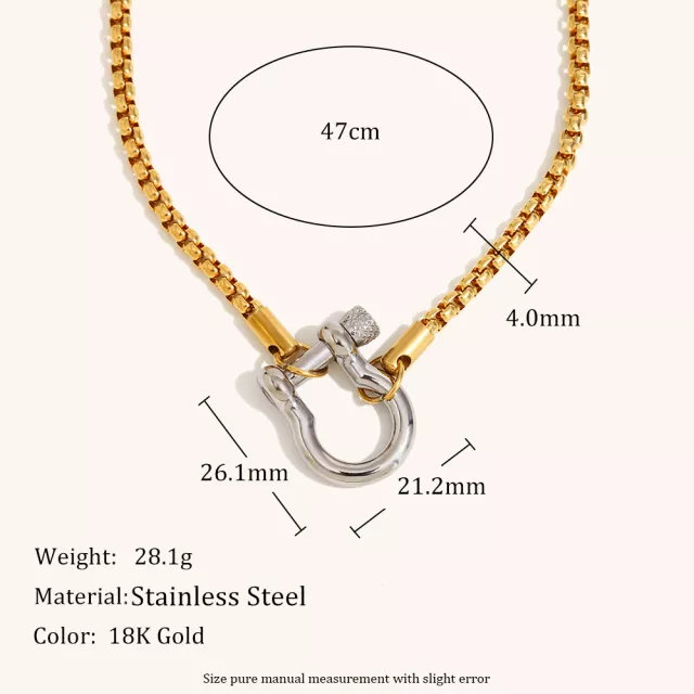 This necklace is crafted from high-quality 316L stainless steel and finished with luxurious 18K gold PVD plating for long-lasting shine and resistance to wear. It’s waterproof and hypoallergenic, making it perfect for all-day comfort, even for sensitive skin. With a weight of approximately 1 oz (28.1g) and a length of 18.5 in (47cm), it’s a bold yet wearable accessory that lays beautifully around the neckline.