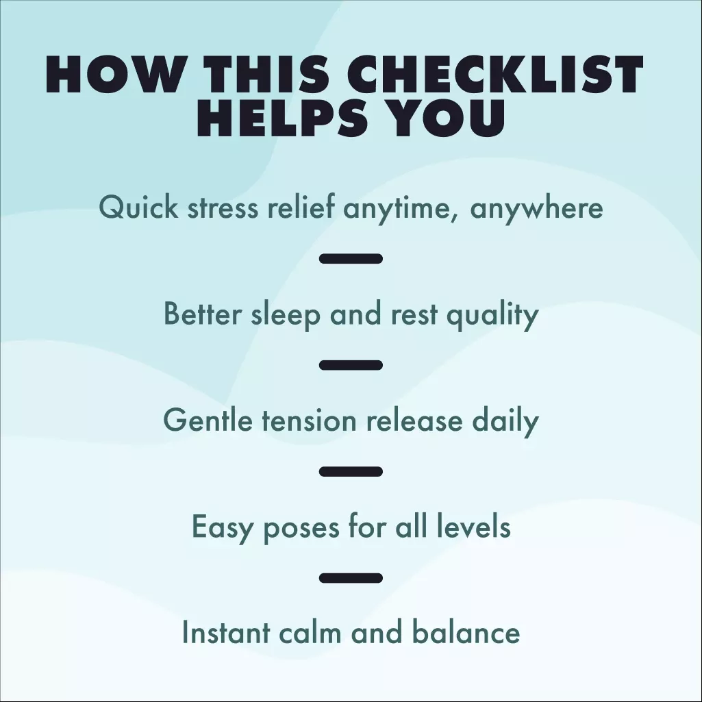 This digital download is perfect for anyone seeking calm and balance. From busy professionals needing an end-of-day reset to yoga beginners looking for simple guidance, this checklist makes relaxation accessible. Unlike other guides, it’s straightforward, concise, and designed to fit easily into your daily life—no complicated sequences or equipment required.