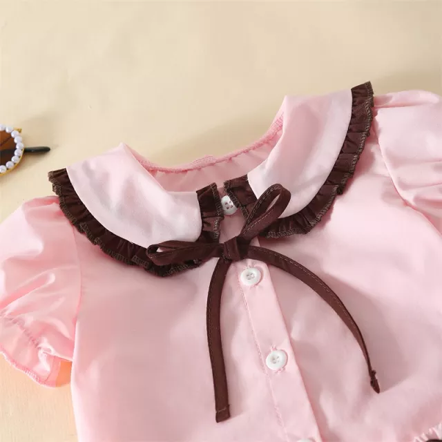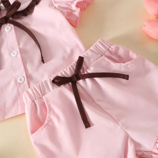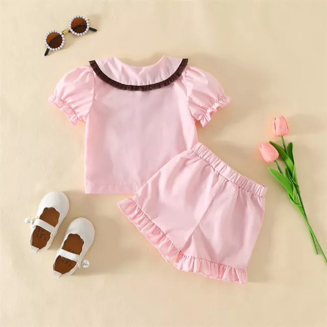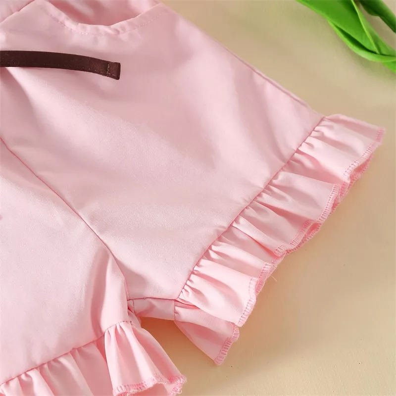With a short-sleeve button-down top and easy-to-wear pull-on shorts, this set is designed for both comfort and ease. Whether it’s bedtime, playtime at home, or a lazy summer morning, this outfit is a lovely choice for your toddler’s everyday wardrobe. The charming contrast colors and playful ruffle details make it stand out from ordinary sleepwear, giving your little girl a stylish, picture-perfect look.